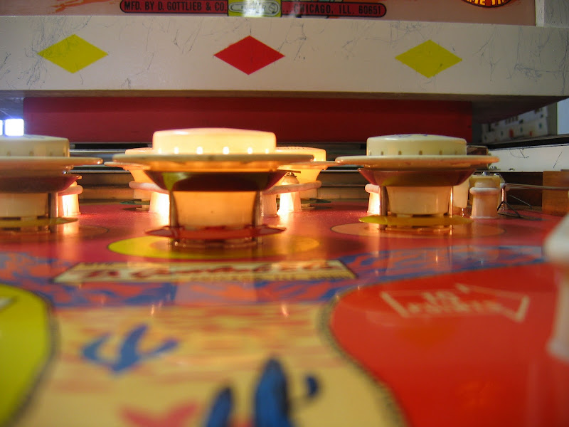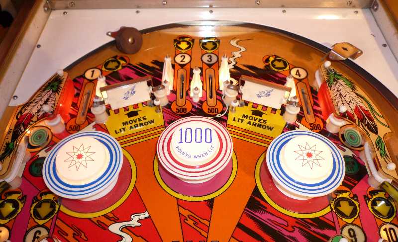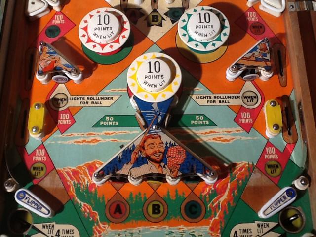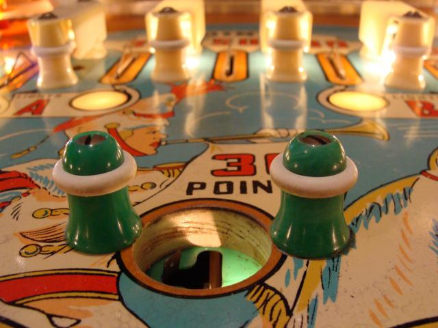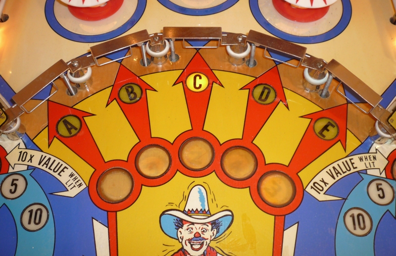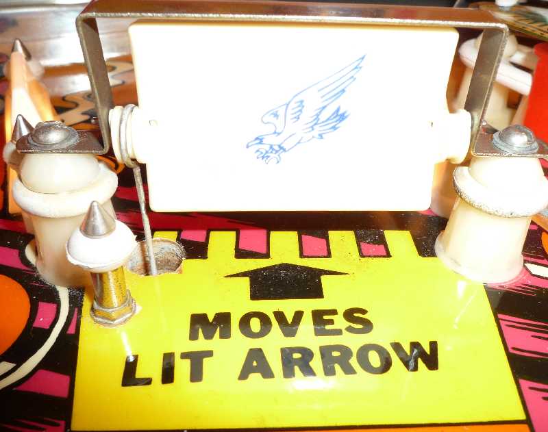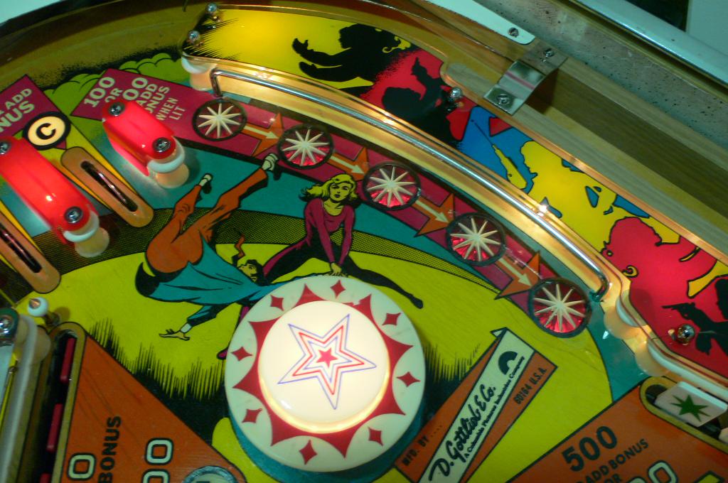 La bille débouche sur le classique trois couloirs/trois bumpers cher à Gottlieb. Le bumper central donne 1 000 points, les autres, 100. Les couloirs A-B-C donnent le 2 X bonus (4 X en 3ème bille).