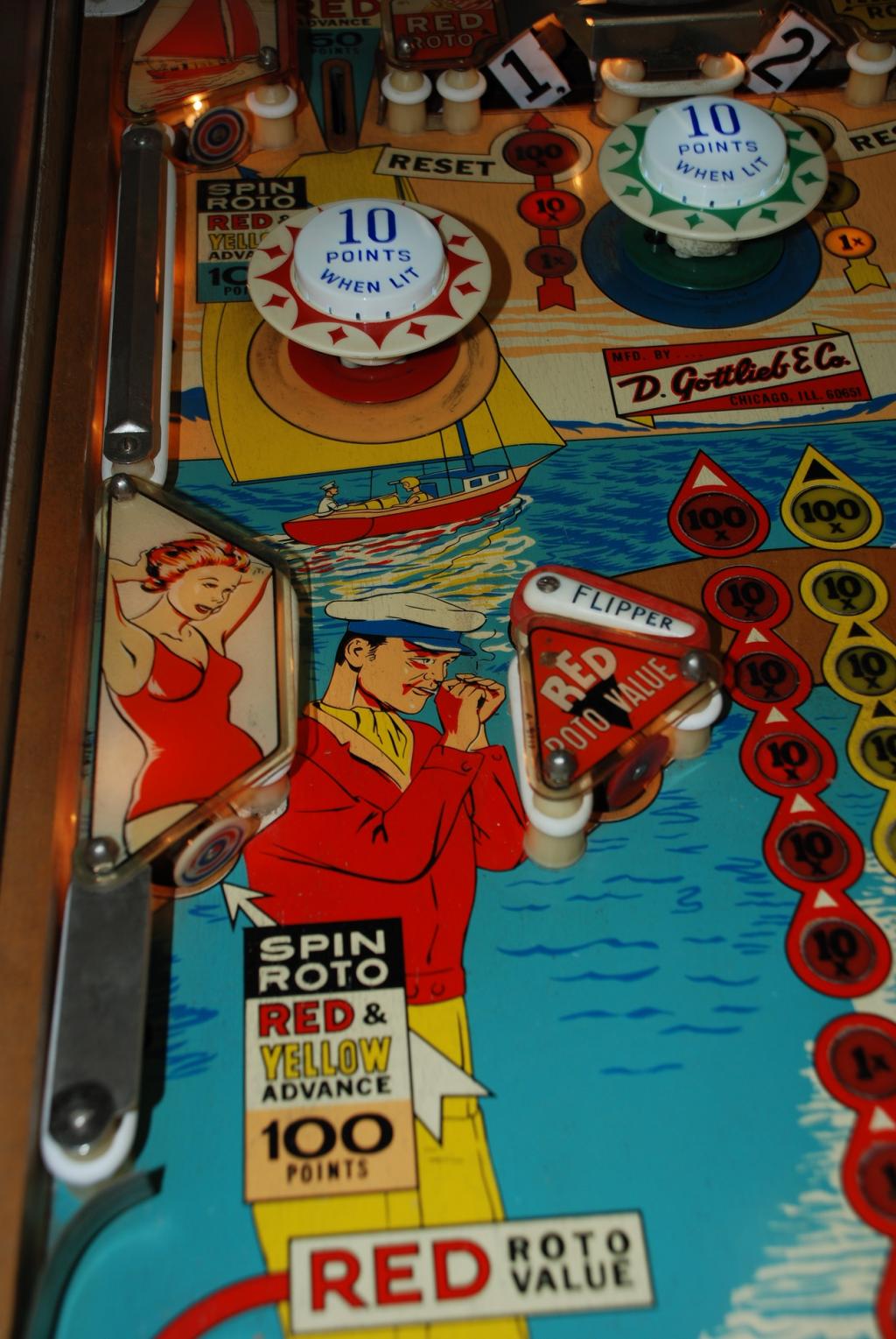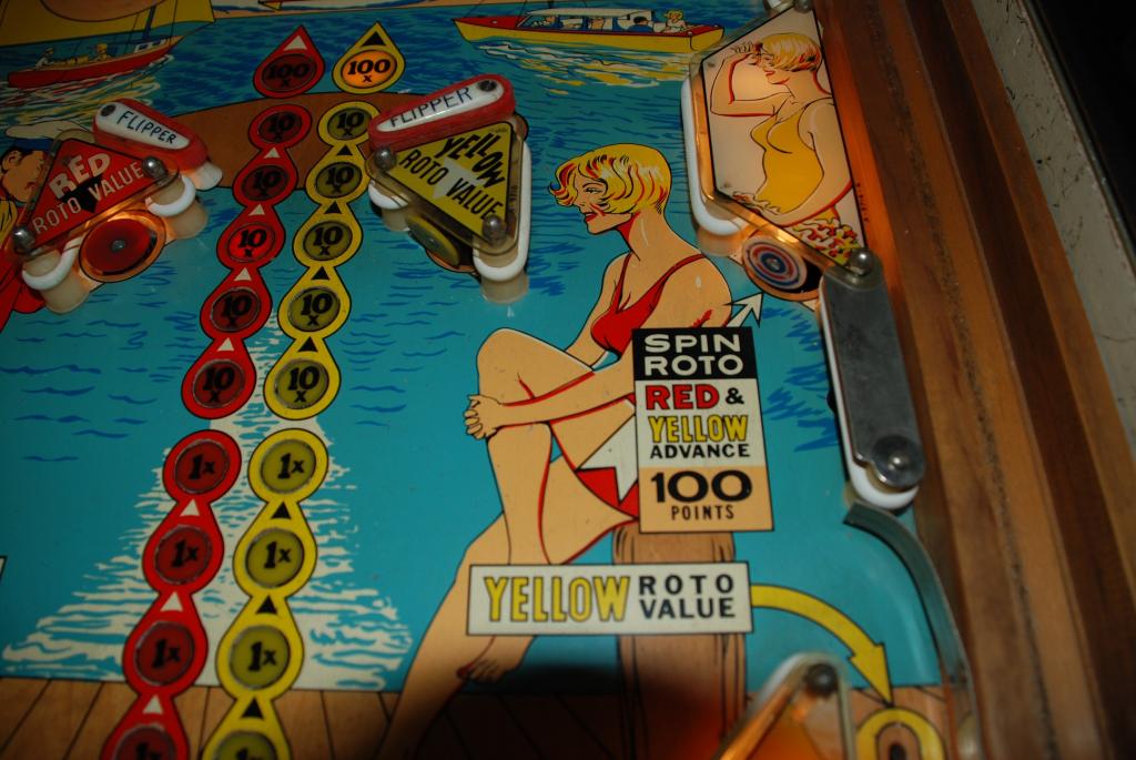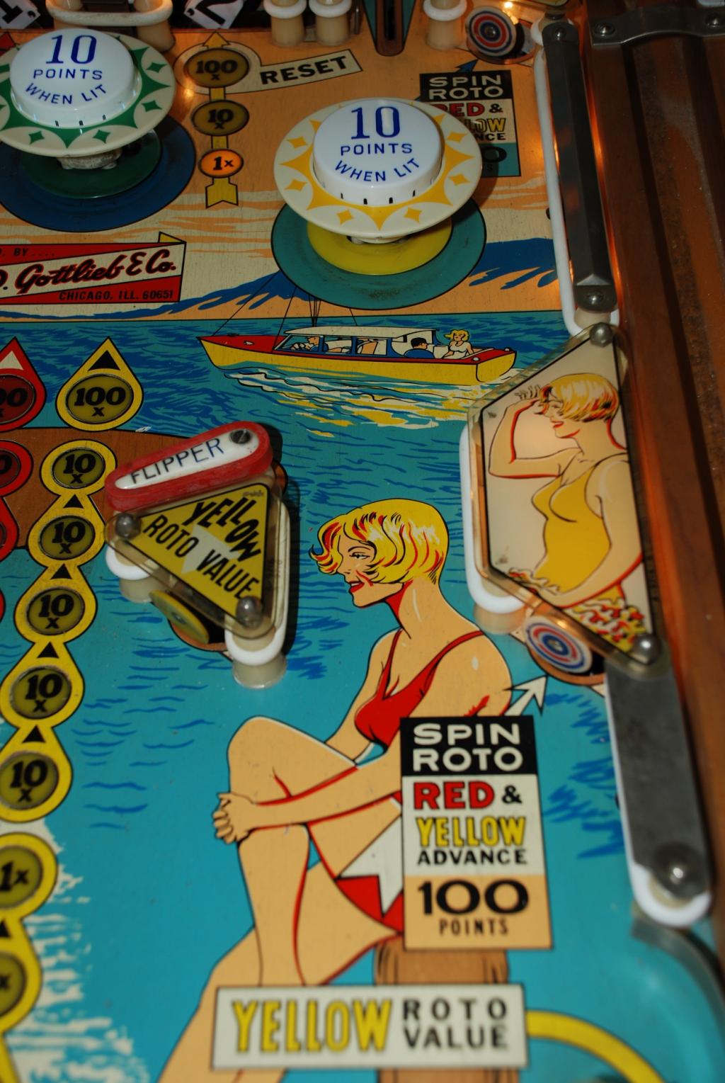 le jaune, 3 targettes et un rollover sur tout le coté droit du flipper