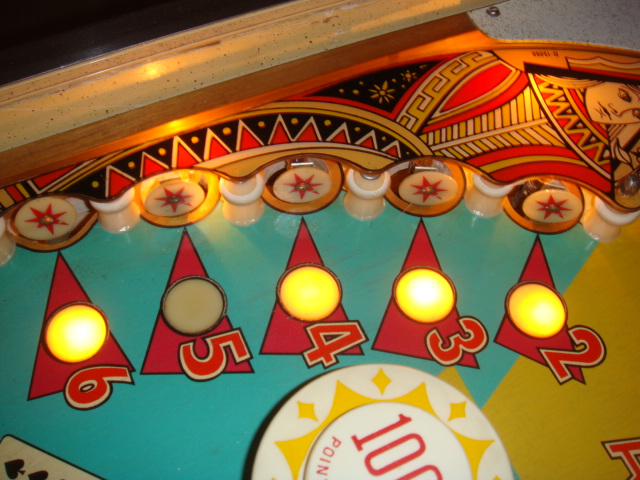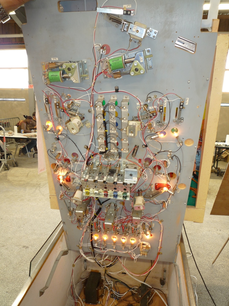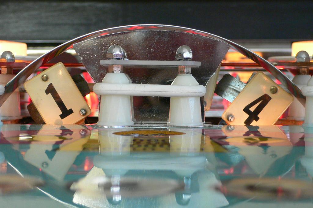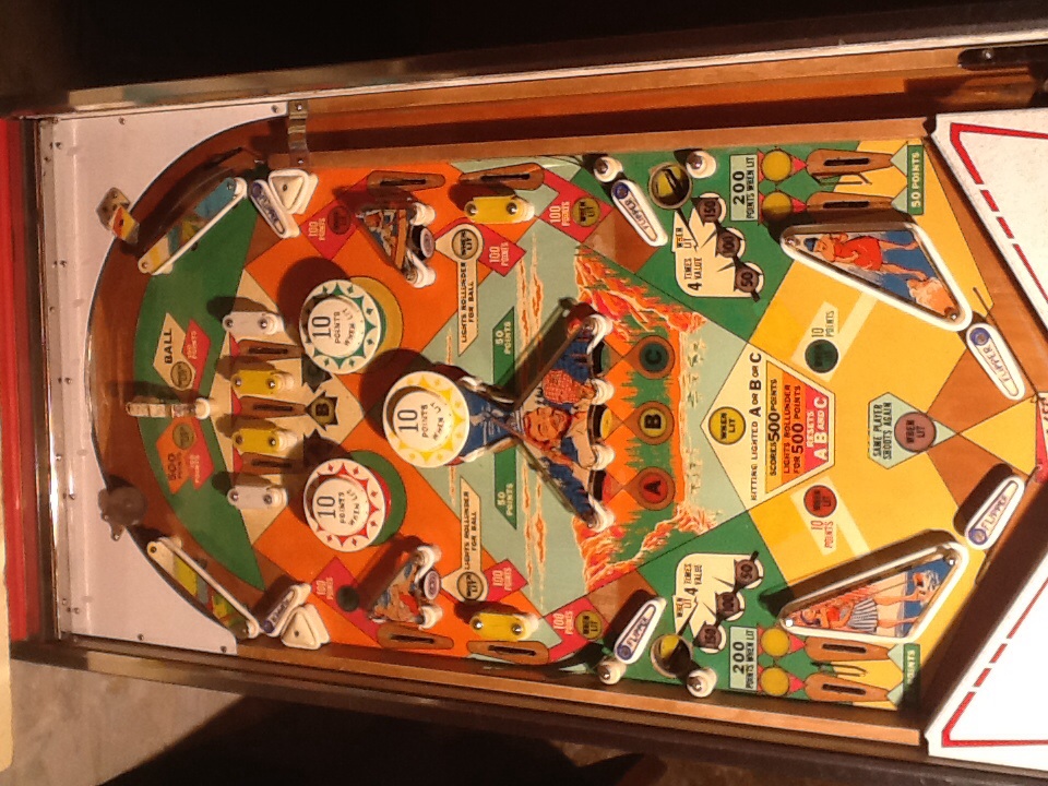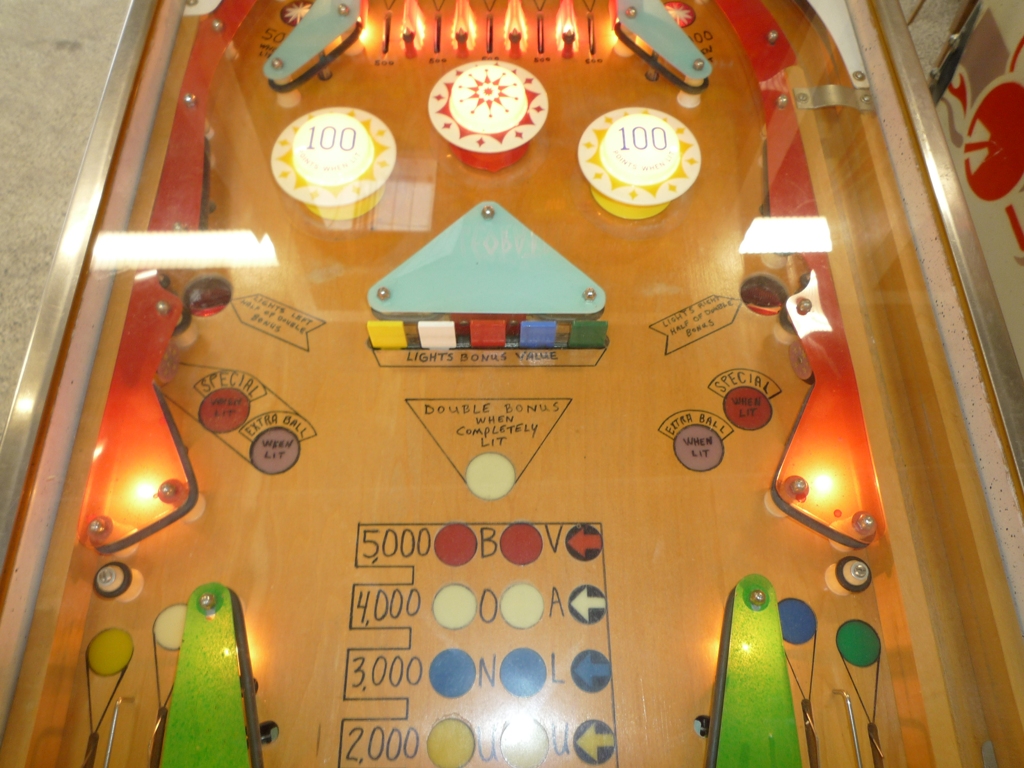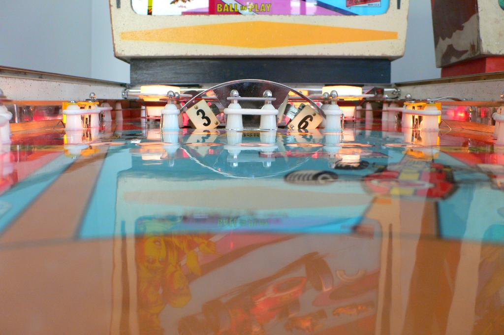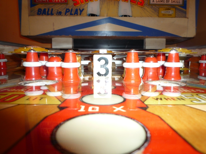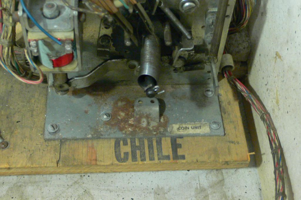 Une bonne partie des derniers flippers électromécaniques fut exportée en Amérique du Sud, le jeu que je vous présente arrive tout droit du Chili; la planche de fond estampillée « Chile » en témoigne.