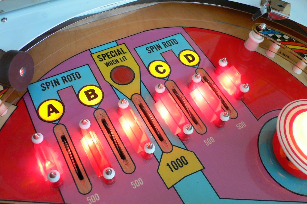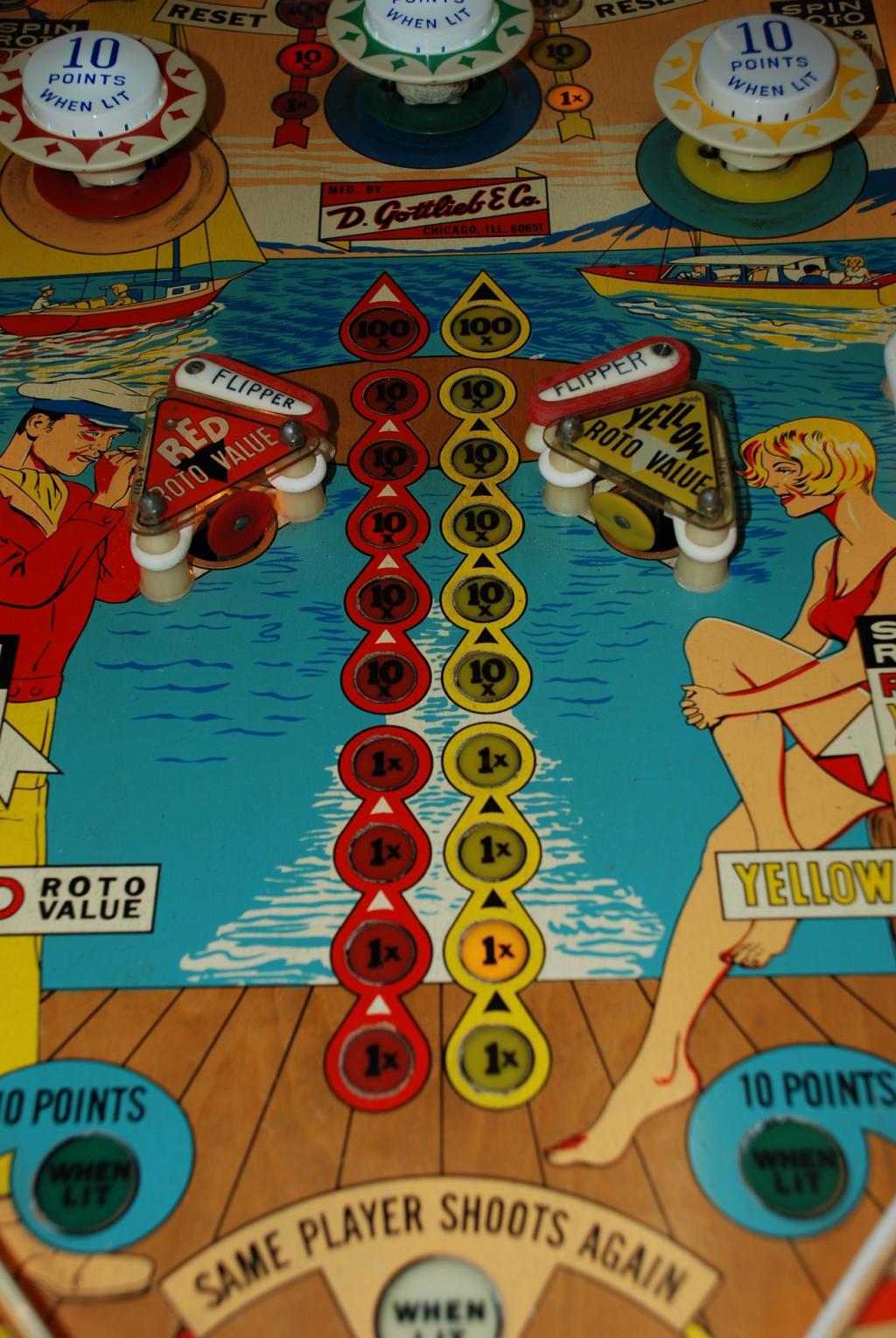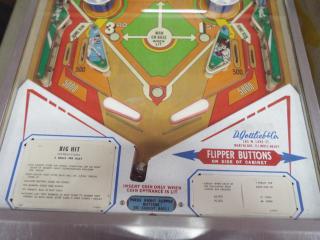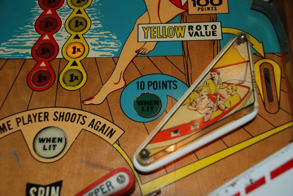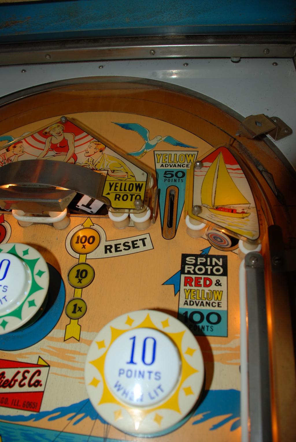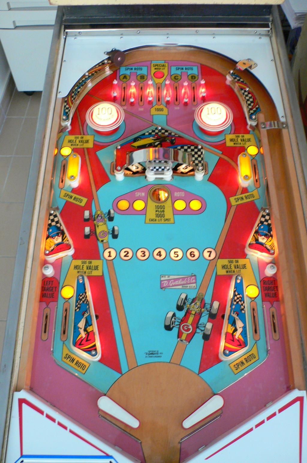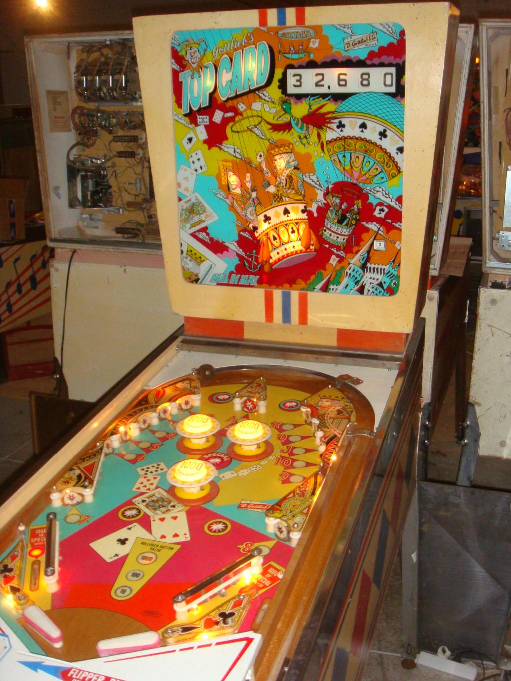 Une bonne partie des derniers flippers électromécaniques fut exportée en Amérique du Sud, le jeu que je vous présente arrive tout droit du Chili; la planche de fond estampillée « Chile » en témoigne.