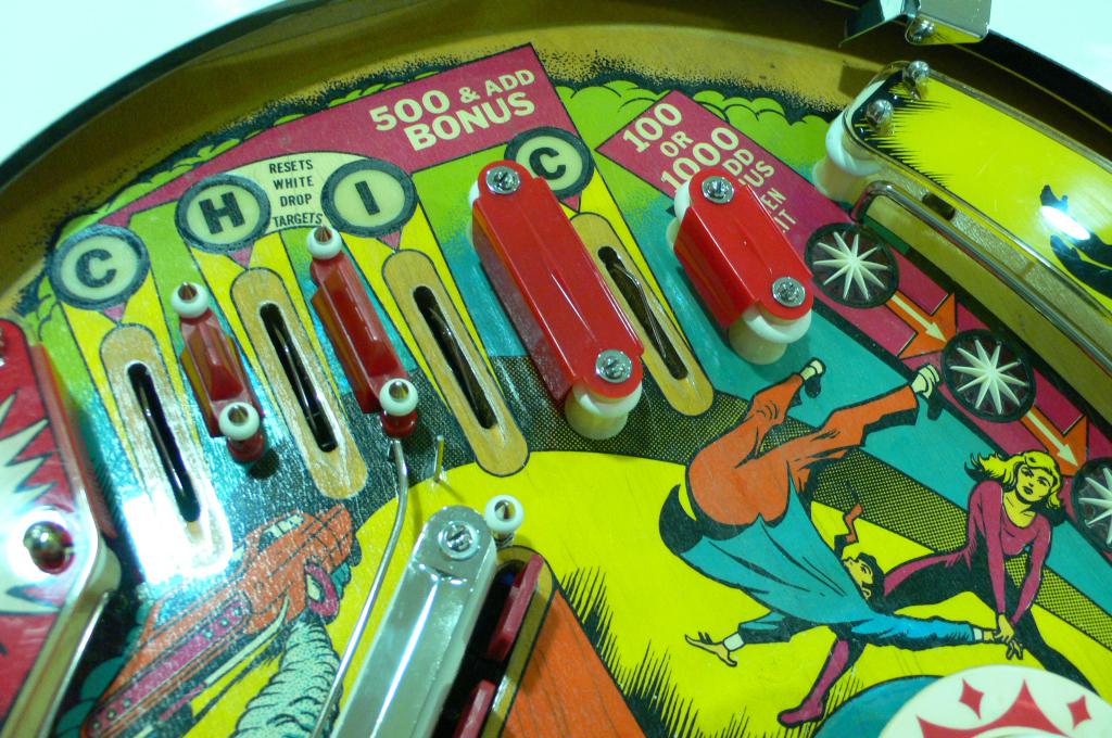 Autre surprise, l’énorme décor central, également emprunté sur certains flips des années 60, orné de quatre cibles fixes. Mais l’atout majeur de ce jeu est évidemment, comment ne pas le remarquer du premier coup d’œil : les deux rangées de 10 drop targets chacune.