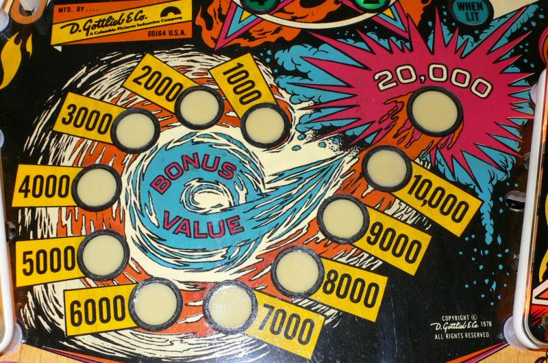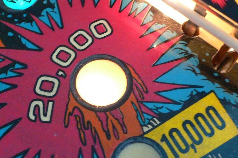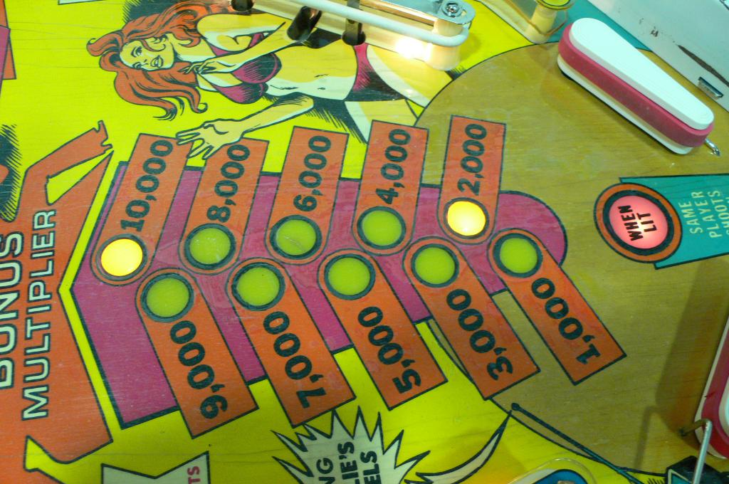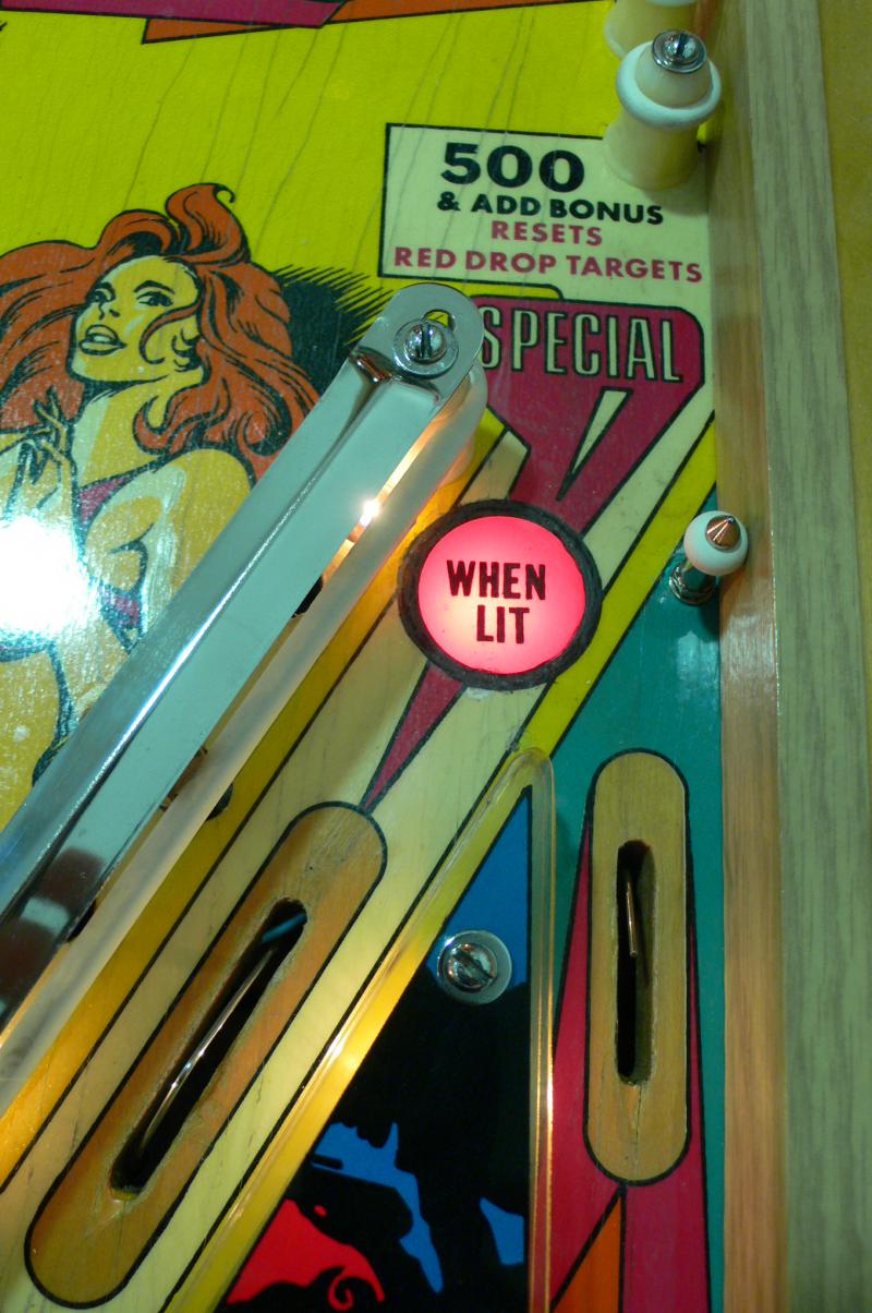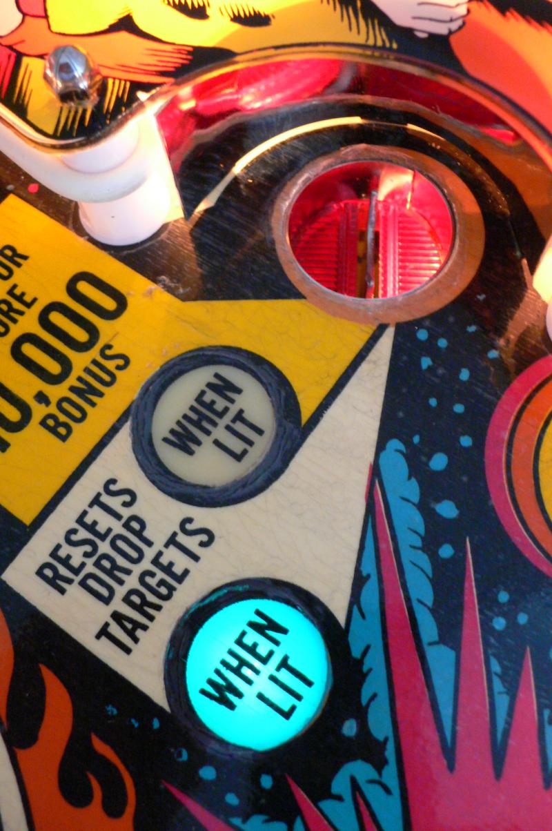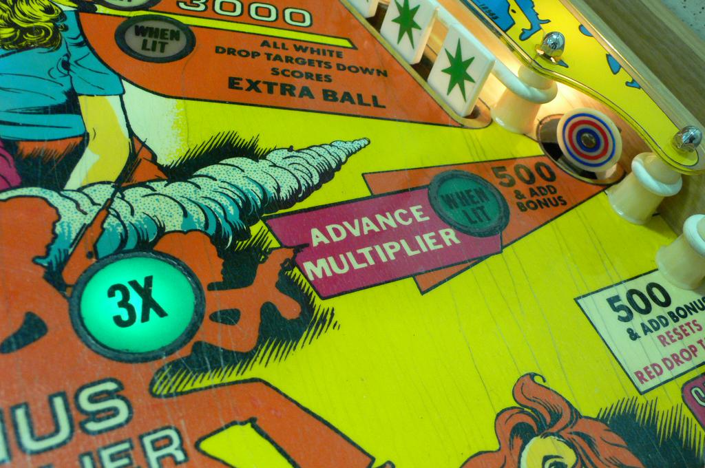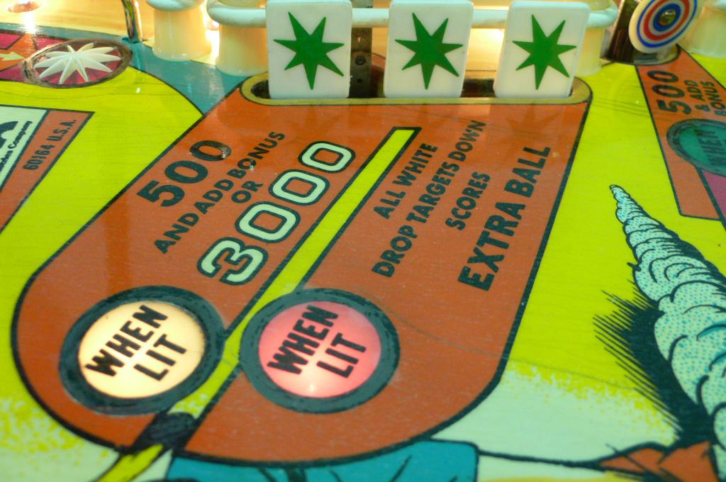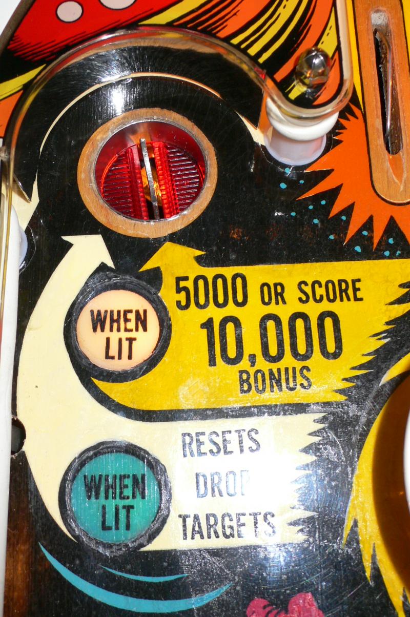 Les targets, qui donnent …300 points, et 1 000 points de bonus allument l’extra-ball une fois abattues toutes les trois. Les trous supérieurs droite et gauche donnent 3 000 points cash plus 1 000 points de bonus par target abattue.