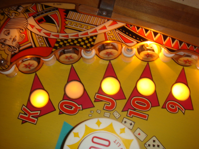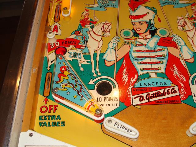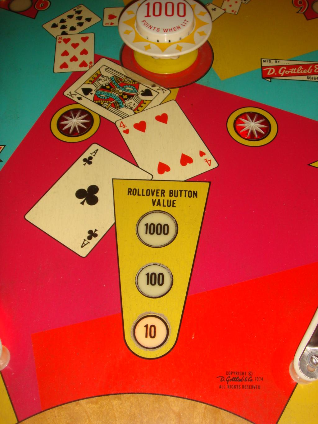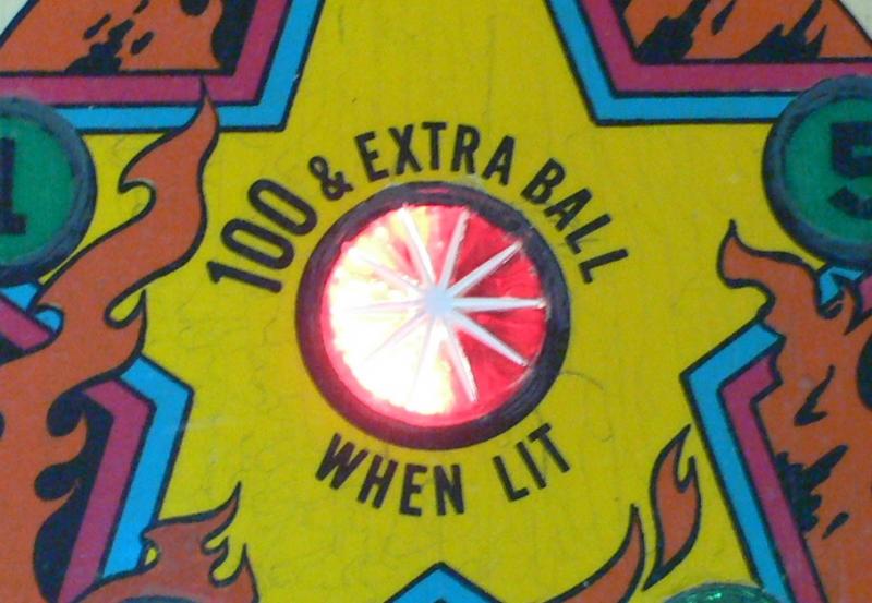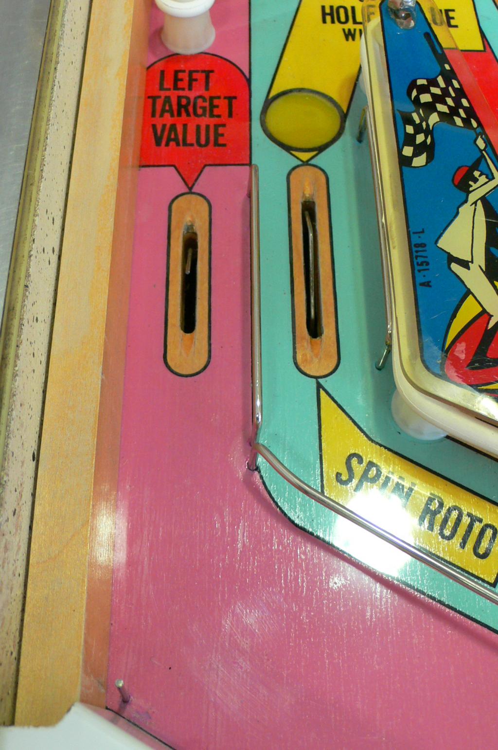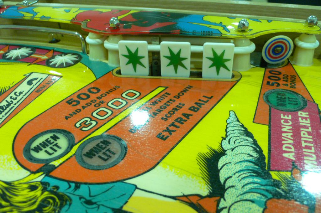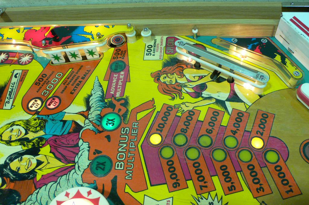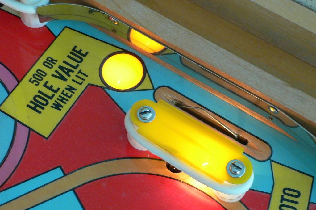 Les targets, qui donnent …300 points, et 1 000 points de bonus allument l’extra-ball une fois abattues toutes les trois. Les trous supérieurs droite et gauche donnent 3 000 points cash plus 1 000 points de bonus par target abattue.