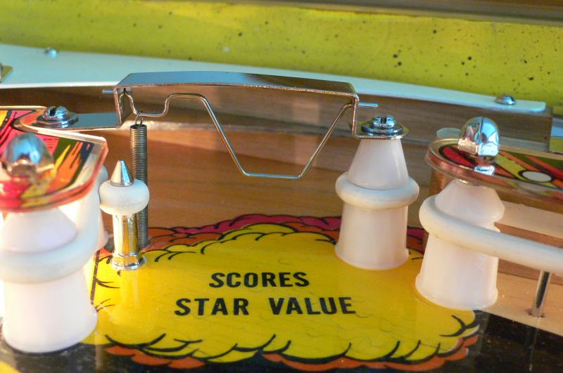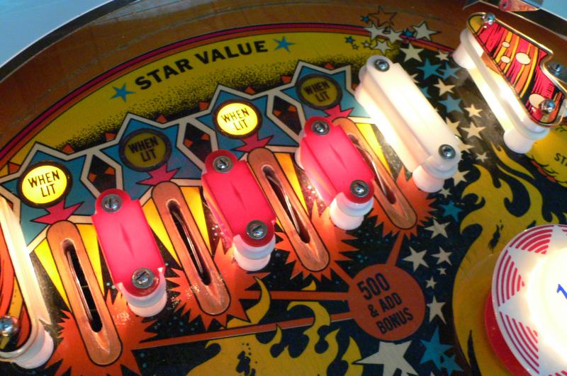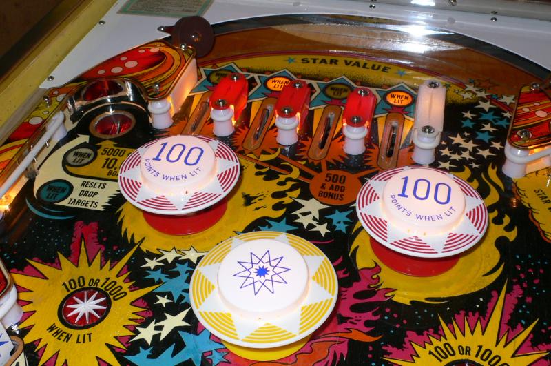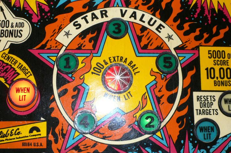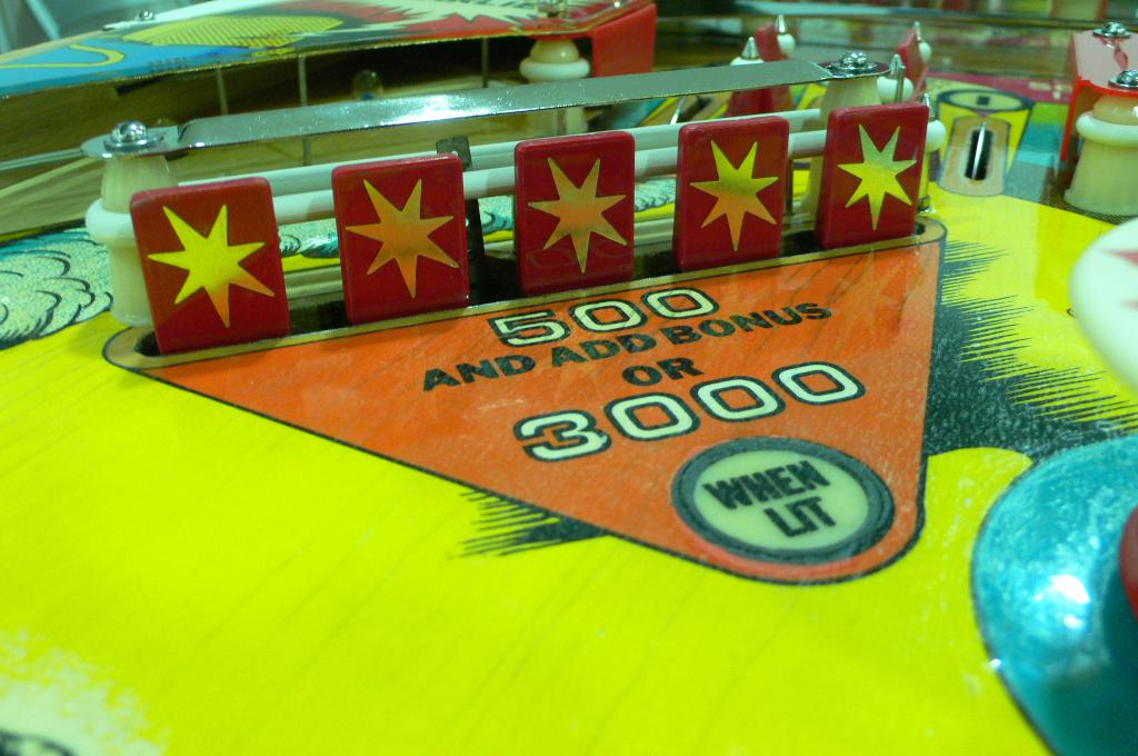 Face au bumper, et disposées sur la droite, 5 drop targets devant lesquelles se trouve un point lumineux indiquant la valeur de la cible : 5000 si allumée ou 500 points.