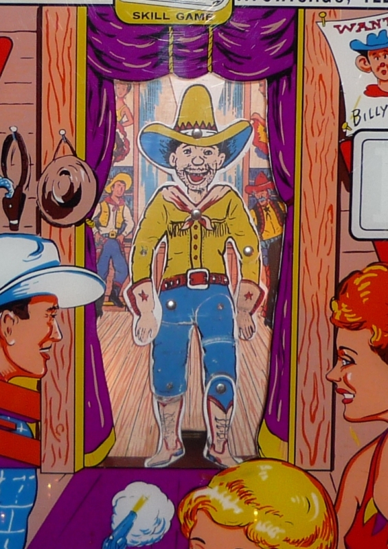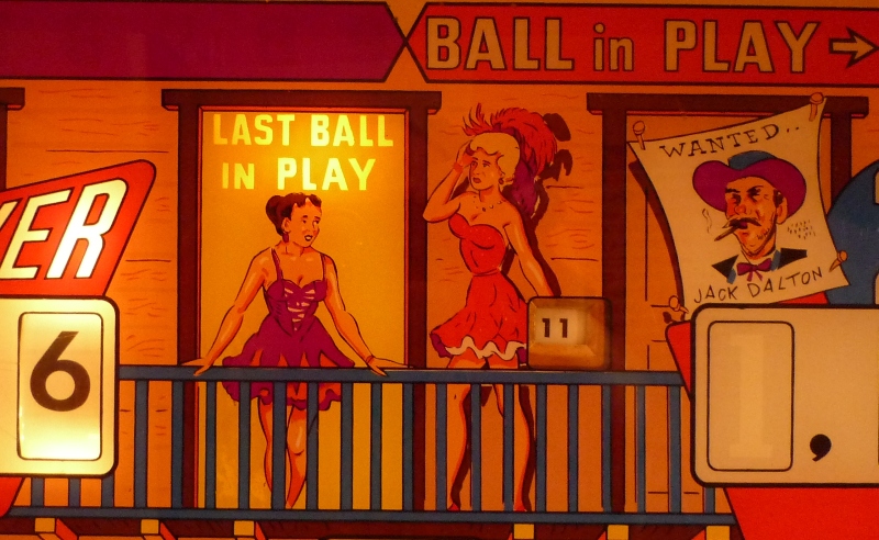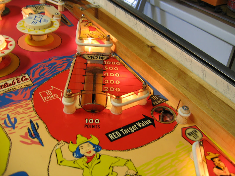 La valeur « 5000 points » se déplace également de couloir en couloir, mais il n’est pas facile de tomber au bon moment. A noter que les drop targets du bas sont décorées  d’un cheval tandis que celles du haut sont décorées avec des cactus, comme pour montrer la difficulté d’abattre la bonne cible.