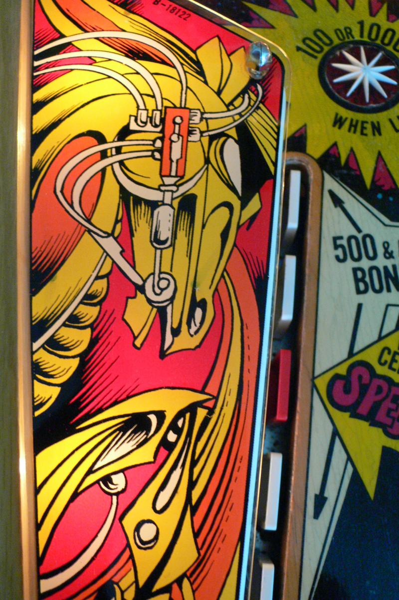 A partir de la mi-plateau, la gaîté du cavalier est rassurante, d’autant plus qu’il regarde en direction d’une belle rangée de 10 drop targets, accessibles aussi par 2 petits flippers qui viennent en relais des raquettes du bas. C’est la cerise sur le gâteau car d’en bas on peut abattre aussi toutes les drop targets. Même principe de point lumineux qui se déplace, décuplant la valeur de la cible allumée. La sélection change par le biais de l’étoile sur la jambe du cavalier ou de la cible fixe sur le bumper du bas. Admirez au passage la taille de la pépite sur le décor du haut.