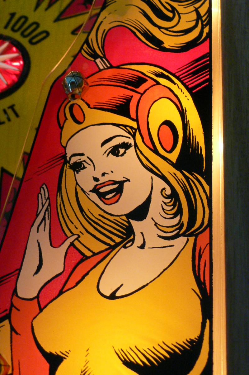 Si la décoration du plateau est plutôt réussie, la backglass est pas mal dépouillée en ne représentant que les 3 héroïnes ainsi que le graphisme de la série sous différentes couleurs.