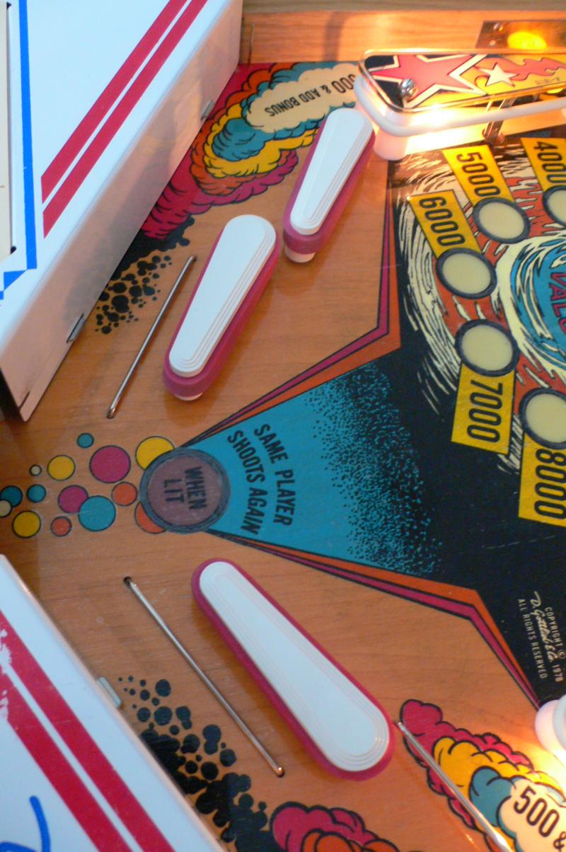 Je joue de temps en temps sur ce flip chez mon ami Michel, en Normandie, lui préférant nettement l’OXO, qu’il possède également. Difficile de faire des scores très élevés sur ce flip. L’extra-ball est difficile à gagner. Heureusement, le 4 X bonus peut donner un coup de pouce pour battre un record en cours, c’est ce qui m’a sauvé par trois fois, record : près de 260 000 points, dans la douleur et une après-midi entière à jouer dessus. Je suis reparti de chez lui content mais passablement crevé, et puis, j’avais hyper mal aux mains, et pour conduire 200 bornes avec des moignons…