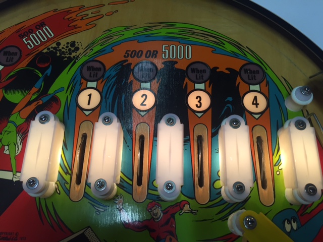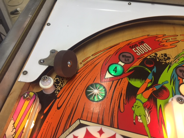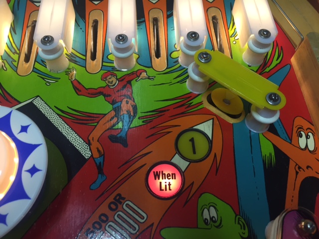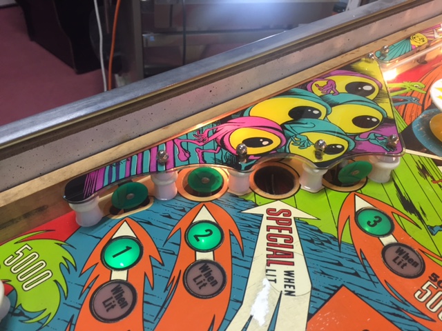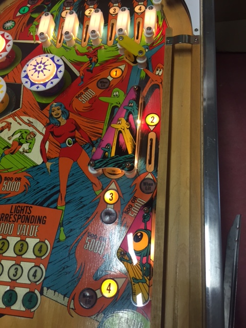 le jaune, 3 targettes et un rollover sur tout le coté droit du flipper