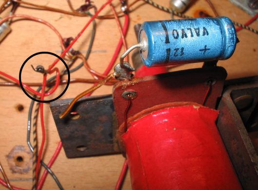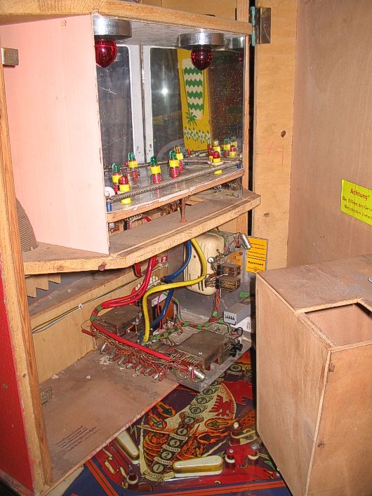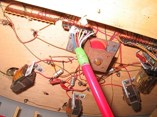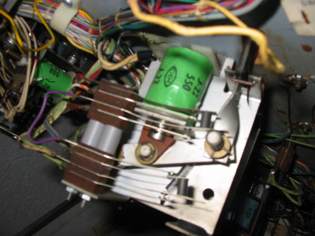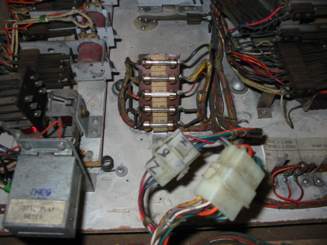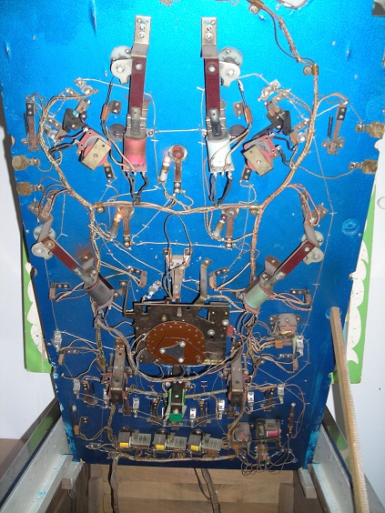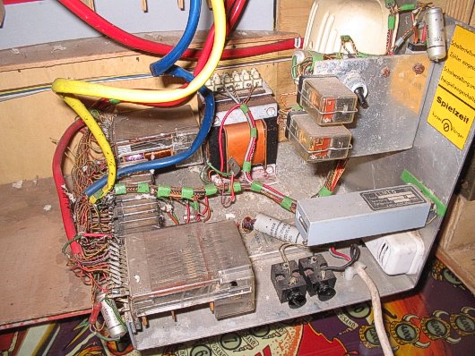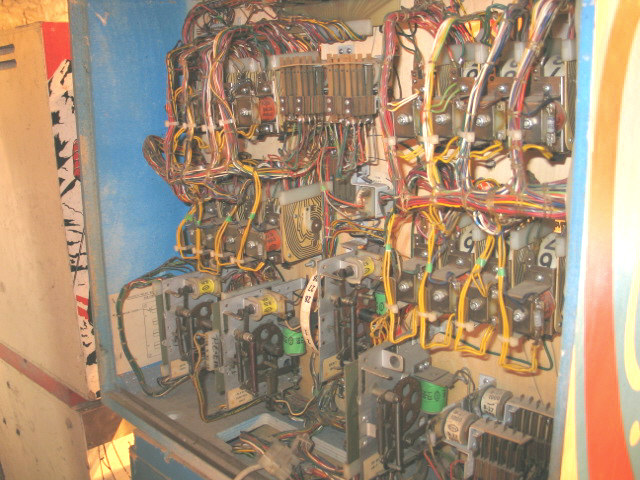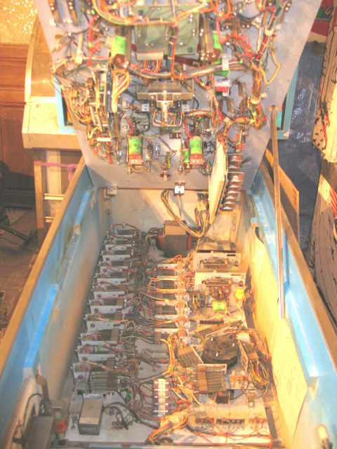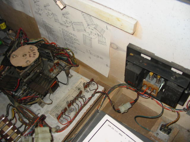 la planche de fond qui est en fait à l’arrière du flip et qui en plus est coulissante, un moteur gottlibien, un gros transfo, une rangée de fusibles et des diodes sur un radiateur