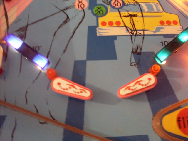 Il n’est pas rare de trouver sur les Gencos des doigts de flipper de couleur. Ici, ils sont jaunes cela rajoute encore du charme à ce  plateau.