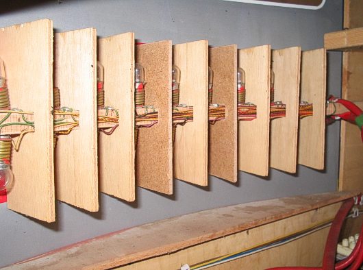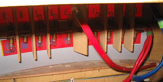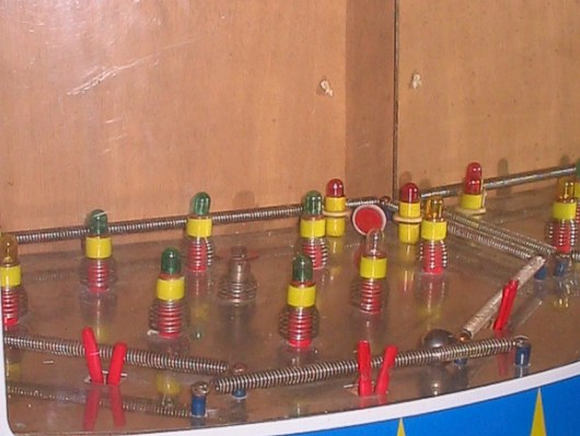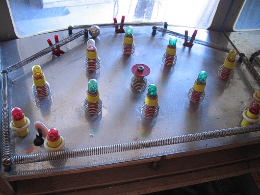 Celle-ci passe sous le plateau ou les boules sont allumées et touche sur son passage des contacts correspondant à chacune d’entre elles. Le plateau sur lequel circule la bille est entièrement nu.