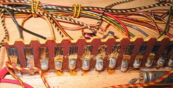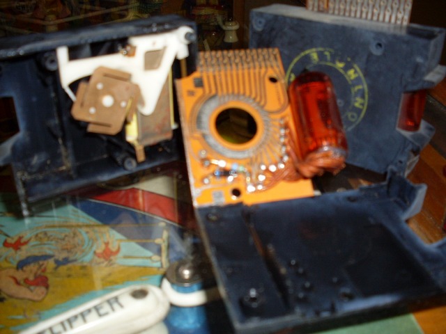 les fameux tubes "Nixies" qui font penser à de l'électronique qui sont en fait composés de dix filaments, un pour chaque chiffre et commandés par une "araignée" de type williams ,mais miniature tout ça enfermé dans un bloc plastique, attention le tube à gauche n'est pas les crédits mais les dix mille et oui les points sont réels pas comme certaines marques que je ne citeraient pas Mr. Green avec des zéro factices, dix d'avance on vous dit