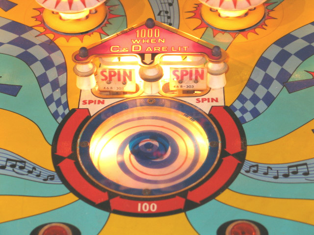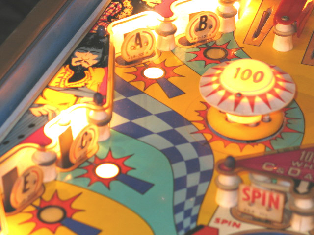 Le plateau, ici dans son jus, rappelle étrangement le concept du Jungle de Gottlieb avec son bumpser semi-captif, sauf que les cibles tournantes sont disposées sur les couloirs latéraux. Le plateau est un peu plus gai avec sa couleur "or" (tiens donc...).