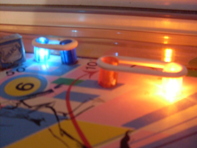 une vue d'ensemble du plateau, chose importante, il n'y a pas de décors et tous les plots sont éclairés par l’intérieur ce qui fait ce coté fluo que j'adore, les ampoules sont des lucioles en 12V, si si, les ampoules 44 en 7V et les ampoules du bonus en 24V ouf, comprenne qui pourra.