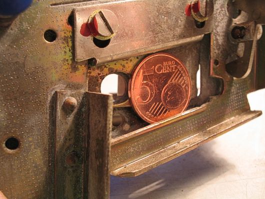 Mais le plus étonnant se situe dans la partie supérieure. Effectivement, il ne s’agit pas d’un vulgaire contact logé dans le couloir de la bille, mais d’un système avec un aimant. Quand la bille rentre dans son logement, elle attire l’aimant qui entraine un changement de position d’une pièce métallique montée sur un axe, ce qui à pour effet de fermer un contact se trouvant de l’autre côté de cette tige. Très astucieux, ça évite les imprécisions dû au rebond que pourrait avoir la bille dans son logement (pure déduction de ma part).